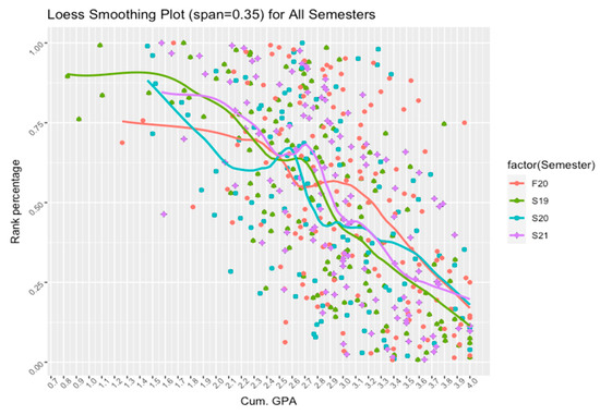 Figure 2 represents the scatterplots of cumulative GPA versus rank percentage for all four cohorts. We employ the “Locally Estimated Scatterplot Smoothing” (LOESS) method for fitting a smooth curve between two variables of cumulative GPA and rank percentage. A span value of 0.35 is also utilized to control the degree of smoothness. As the graph suggests, in all instruction modalities, the rank percentage values decrease as the cumulative GPAs are increasing, i.e., it can be observed that there exists a potential inverse relationship between the cumulative GPA and rank percentage.