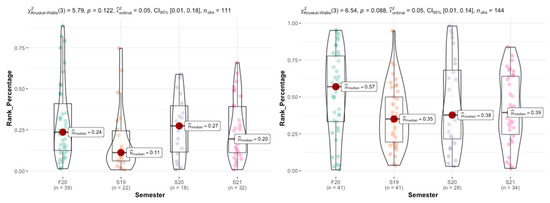 To analyze the data and present them in the findings, firstly, we use descriptive analysis using some graphs (violin plots) and simple statistical parameters such as mean. Secondly, statistical methods are also used to draw more conclusive results. The tests include the Kruskal–Wallis test for differences in academic performance across all four cohorts, and Mann–Whitney U tests to test for differences in rank percentage between each pair of the cohorts. In Mann–Whitney and Kruskal–Wallis tests, the test statistic only depends on the ranks of the observations, and no assumption about the distribution of the population is made. The former is used for two samples, whereas the latter is used when there are two or more samples. These non-parametric tests are employed because our observations do not follow the normality assumption. Statistical tests are also performed using R software (version 4.0.3) and the R package “ggstatsplot”, with the most common analysis options combined with a graphical output [41].