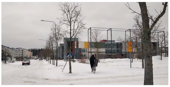When it comes to the sustainability of cities, Student 25 lists garden plots, public transport, and natural environments, among others, as fundamental elements. According to Student 14, the above-mentioned elements can be found in the Viikki region. Student 25 has lived there for 10 years in their childhood. In Figure 1, the primary school and the upper secondary school of Viikki can be seen on the right side and the building where Student 25 lived as a child on the left side of the road. One of the main reasons that Student 25 chooses Viikki as the topic of the essay is precisely the aspect of an ecological lifestyle.