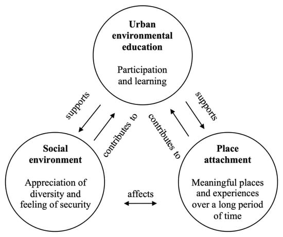 Figure 3. Urban environmental education that takes into consideration social environment and place attachment, adapted and modified from [45] (p. 167).