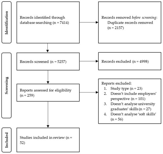 It is clear that the hiring processes of businesses are affected by many factors that determine how graduates enter and stay in the world of work. This systematic review aims to analyse which university graduates’ transversal competencies or soft skills are most highly valued by employers at the international level. It aims to contribute to the scientific literature by analysing: the characteristics of employers who hire university graduates; the methods that are used to analyse transversal competencies; the identification, definition, and classification of those competencies; and the selection of the most important (Top 10 transversal competencies) for companies in today’s job market. The following research questions (RQs) were formulated: