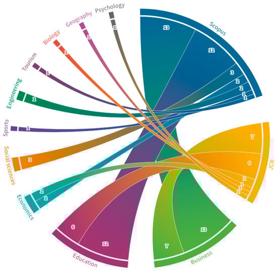 There were more publications from the Scopus database (n = 34), with Business (n = 20) and Education (n = 18) being the knowledge areas with the most publications. There was a balance between Education, Business, and Economics in Scopus and JCR. In contrast, there were publications in the areas of Social Sciences, Sports, Engineering, and Tourism only in Scopus, whereas Biology, Geography, and Psychology were found only in JCR.