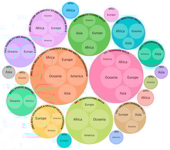 Once the classification scheme was created, the next step was the analysis of the transversal competencies that were most highly valued for university graduate employability by exploring the importance, both globally and by continent. The criteria for determining which competencies were most highly valued was to select those in the Top 10 positions in the classifications of the studies. In papers with fewer than 10 items, the competencies in the upper half of the list were selected. This method was chosen because of the variety of the classifications and the research instruments that were used in the reviewed studies.