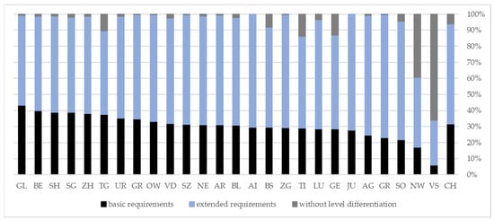 As Figure 1 shows, the proportion of the two levels is different among the cantons, which implies unequal opportunities among the cantons [7]. Only a few cantons offer a comprehensive system without level differentiation (an integrated model). Furthermore, in some cantons, children can already enter baccalaureate school at the end of primary schooling (long-term baccalaureate) or after the first or second year of lower-secondary education. (In Figure 1, this “pre-baccalaureate track” is integrated into the advanced-requirement track). The municipalities of certain cantons have a great deal of leeway in implementing cantonal guidelines. The extent to which pupils are separated into different tracks, the number and permeability of tracks, and the distribution of pupils between the two requirement levels can therefore greatly differ within cantons [8,11].