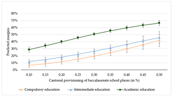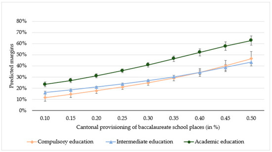 Figure 3 (model 1) and Figure 4 (model 2) show how the probability of all three groups (academic education = green dots, intermediate education = blue triangle, and compulsory education = orange rhombus) depends on the cantonal provisioning of places. It increases for all groups as the cantonal provisioning of baccalaureate school places increases (Hypothesis H1).