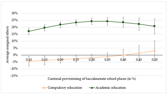 Predictive margins with 95% confidence intervals of entering baccalaureate school by cantonal provisioning of baccalaureate school places for pupils of compulsory and academic familial educational background compared to pupils of intermediate familial educational background (controlling for all explanatory and control variables of model 2). Data source: FSO, Longitudinal Analyses in Education (LABB).
