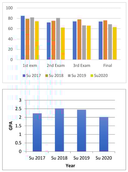 Comparison of exam grades and course GPAs from 2017 to 2020.