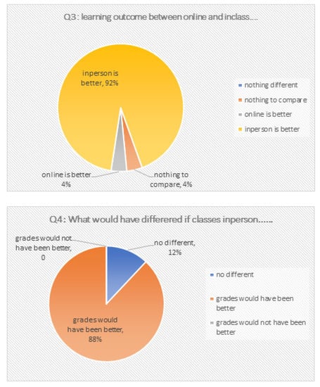 - A total of 92% of the students stated that they had better learning outcomes when taking in-person courses, while 4% found online instruction better, and the other 4% did not see a difference (Q3, Figure 2).