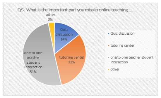 - A total of 41% of the students stated that they most missed the one-to-one student–instructor interactions; 32% indicated that they most missed the availability of the in-person tutoring center; 14% most missed the reinforcement quiz discussions with their peers; and the rest chose “other” (Q5, Figure 2). The survey results from Q5 showed that students in General Chemistry at Xavier place significant value on in-person interactions.