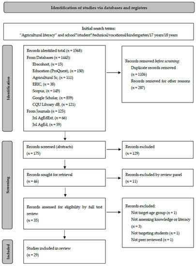 The transparent method by which the literature was selected for analysis was adapted from the processes of the Preferred Reporting Items for Systematic reviews and Meta-Analyses (PRISMA) protocol [16], and informed by debates in the literature regarding the naming of reviews as either systematic or scoping [17,18]. The purpose of this review was to develop a systematic process to “uncover international evidence” of research into the concept of agricultural literacy in the context of formal schooling; “investigate conflicting practices” and current practices in developing agricultural literacy; and produce recommendations to “guide future decision-making” in this field of education [17]. The methods section sets out the search strategy, sources of evidence for selection, data extraction criteria, data analysis and its presentation.