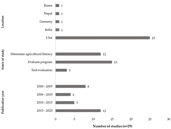 Of the 29 studies which met the inclusion criteria, 25 were in the USA, with one each in Germany, Korea, India and Nepal [7,20,21,22] (Figure 2). Most studies were published in journals focused on agricultural education as opposed to general education, with the Journal of Agricultural Education being the predominant source (n = 11/29). Of the 29 articles analysed in depth, 17 targeted students in grades K-8, and 12 targeted older students in grades 9–12. Studies varied in their reach in terms of within schools/classes, across school districts or states or nationally.