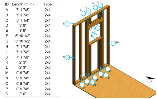 This paper presents a study where students utilize 2D design documentation to determine the element sequencing of wood studs within a wall section. In this exploratory, uncontrolled experiment, two groups of students participated in an intervention, with the first group of students documenting their results on a 2D worksheet, and the other group in AR. The task was selected to resemble a type of carpentry work that is common on jobsites. The scope of the design was limited to a single section of wall to enable participants to understand and perform the task within a single session and within one hour. An elevation view from the 2D documentation provided to students is shown in Figure 1, and the other drawings are included in the Appendix A.