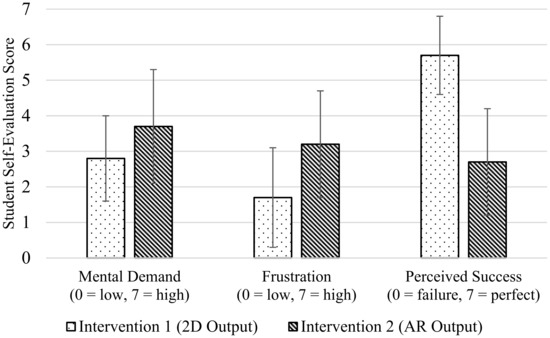 Post-activity survey results of students’ self-evaluations regarding the mental demand (0 = low demand, 7 = high demand), frustration (0 = low frustration, 7 = highest frustration), and perceived success (0 = failure, 7 = perfect) of the 2D Worksheet activity (n = 38) and the AR Experience (n = 15). Averages are shown by the solid bar values and standard deviations are presented with the error bars.