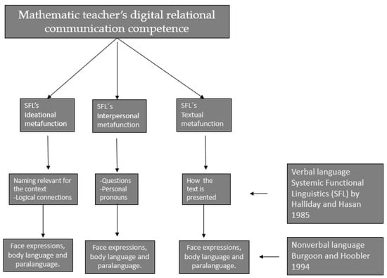 In this pilot study, the aim was to explore a university mathematics teacher’s digital relational communication competence in an online seminar with ten pre-service special educators in mathematics by examining the verbal and nonverbal language in a selected episode that emerged. A micro-analysis was conducted to visualize the interaction. This approach has previously been used when examining relational competence [,], but not in online teaching. Relational competence in this study refers to providing supportive and positive teacher–student relationships, which several researchers stress as essential for students’ learning (see, for example, [,,,,]). This relationship can be understood as a communication process to support learning, where verbal and nonverbal language are considered []. Furthermore, in this study, relational communication competence refers to the capability to communicate verbally and nonverbally by using a language that is understandable and contributes to meaning-making and the progression of knowledge [,]. Nevertheless, one critique of the research on teacher–student relations and teachers’ relational competence is a lack of theoretical frameworks [,]. In this study, to manifest the teacher’s digital relational communication competence, Halliday’s Systemic Functional Linguistics [] was used to visualize the verbal language. Using SFL, language is viewed as a system of meaning, which can be analyzed at the clause level to understand how contexts are reflected in participants’ linguistic choices. SFL has previously been used when examining texts in mathematics [,]. To examine how the verbal language is spoken and received, nonverbal language is connected to SFL’s metafunctions: ideational, interpersonal, and textual (see Figure 1). Nonverbal language in this study refers to facial expressions, gestures, and paralanguage [,,,] since nonverbal language enhances the linguistic meaning of expressions [,,].
