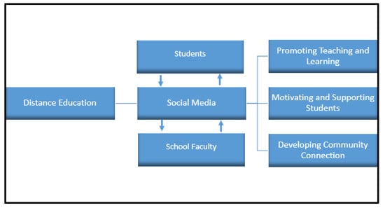 According to Lan et al. [144], social media is a digital learning platform with high interaction between faculty and students. The authors believe that social media in distance education can have a significant contribution to higher education (see Figure 1). Specifically, the present study investigated the following research question: What is the impact of the use of social media in (a) enhancing teaching and learning in higher education, (b) motivating and supporting students, and (c) developing community connection?