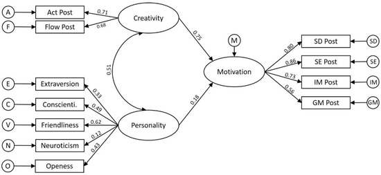 The nature of Act and Flow is particularly evident in the pre-test. Act as the active part of creativity with imagination and communication is mainly determined by SE, followed by SD and IM. On the other hand, Flow was mainly determined by SE (Figure 2) and correlates strongly with GM (Table 7), reinforcing the nature of Flow to be sensitive to external factors and strongly influenced by the social environment [46]. After participating in Starwalker teaching, the close relationship between creativity and motivation became even more significant.