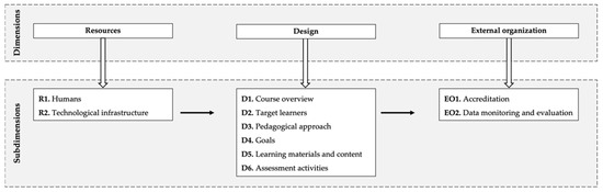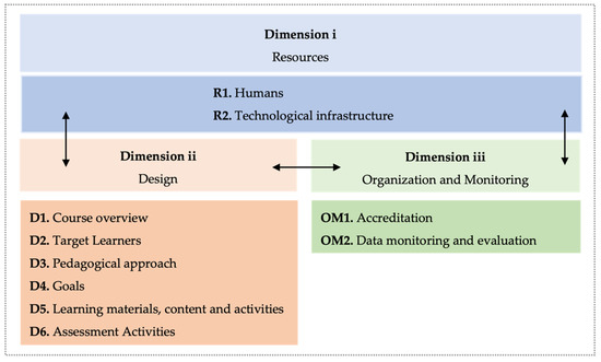 Considering the scoping literature review process adopted and its results, a research instrument was built. The dimensions and subdimensions identified in the theoretical and empirical field to be included in our framework, are shown in Figure 1. For the initial version of the framework, it was proposed that it be divided into three dimensions and respective subdimensions: resources—humans and technological infrastructure; design—course overview, target learners, pedagogical approach, goals, learning materials and content and, assessment activities; and external organization—accreditation and data monitoring and evaluation.