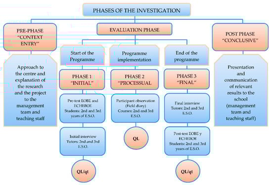 Considering the complexity of integrating methods of a different nature (quantitative and qualitative) [], our research model revolves around three evaluative phases (three-phase and multiphase), preceded and succeeded by two informational phases that facilitate the entry and exit of the research field, and whose methodical sequence is governed by the following protocol: qt (quantitative) → QL (qualitative) → qt (quantitative). The validity of the research is carried out through a time triangulation [] that analyzes the changes produced at the two moments of measurement, pre and post, and an inter-method triangulation combining quantitative and qualitative methods [].