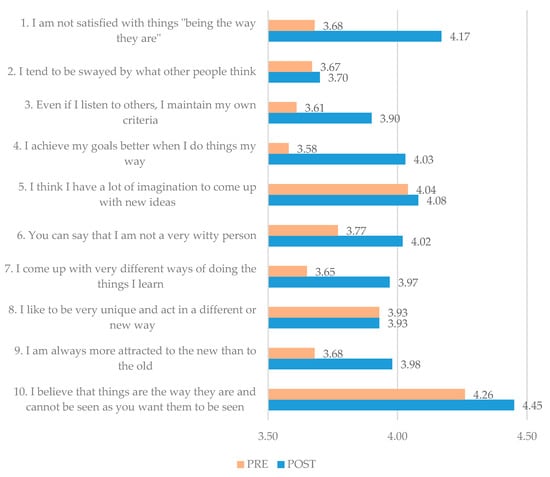 Mean pre (orange) and post (blue) scores of all items that make up Factor 3 (Creativity) of the EOBE scale. Source: Compiled by authors.