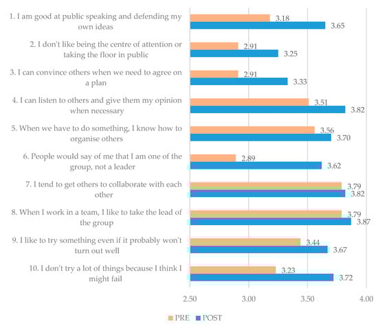 Leadership, for its part, emerges as one of the fundamental pillars of any current educational policy with the overt intention of promoting human and economic development in all spheres [,]. Likewise, in the framework of entrepreneurial identity and, therefore, of entrepreneurial competence, leadership assumes a central role that is difficult to replace. For this reason, the Arteso Project has focused on strengthening it and creating situations conducive to its promotion. The results of the EOBE scale, Factor 2 (Leadership), show the positive achievement of this aim (Figure 6).