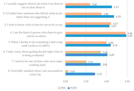Within the framework of the Arteso Project, very positive results have been obtained on issues linked to proactivity, risk-taking, initiative, conflict management, etc. (Figure 7). These results point to effective development and impulse on the agential and intentionality of the subject, and the processes of self-regulation and self-evaluation needed for effective promotion of the entrepreneurial identity [,].