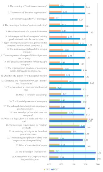 Mean pre (orange) and post (blue) scores for all items comprising Factor 2 (Skills) of the ECHEBOE scale. Source: Compiled by authors.