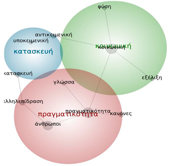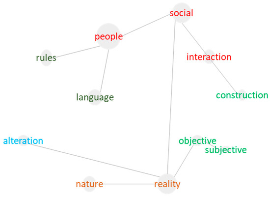 Of course, the above analysis did not attempt an exhaustive presentation of all the Gephi capabilities in network analysis. Nevertheless, the choice of a network presentation, likened with the choice of the measures selected, might reveal different aspects of the causal belief system [51], and this indicates that the role of the researcher in the respective choices becomes central, as well. In the present analysis at the microscopic level, the importance of a node in the network is examined through the measures of degree, closeness centrality and betweenness centrality [51]. The centrality measure of the node concepts highlighted the following: “social”, “reality”, “subjective”, “interaction” and “language”; this means that the nodes in question are more influential and determining factors in the network. Noteworthy is the observation that the concepts of “objective” and “subjective” are very close and strongly interrelated in the network, the interpretation of which suggests that in participants’ collective mental models, the two ontological assumptions are either indistinguishable or both coexist as kinds of reality.