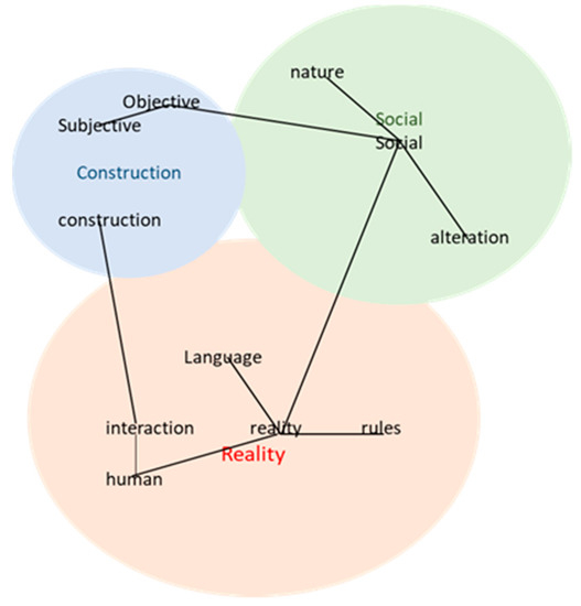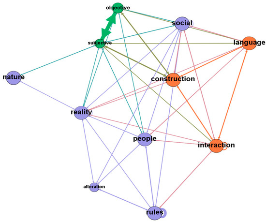 As it was mentioned in a previous section, another pictorial output, the concept clouds, are provided by Leximancer, depicting the most frequent and relevant concepts extracted from the data. (Figure 3). Here, in terms of co-occurrences of the primary concepts, the concept “reality” coexists strongly with the concepts “social”, “people”, “interaction”, “construction”, etc. (Table A2 in the Appendix A). It seems that regardless of the grouping of concepts in a cluster, there are strong overlaps across the map. Similarly, the concept “social” co-exists strongly with “interaction”, “construction” and “rules”. The primary concept “people” co-exists strongly with “interaction”, “construction” and “language”. It is worth noting that as we move on to less strong concepts, the strength of the co-occurrences also decreases (see Table A2). Subsequently, the concept “interaction” is found to coexist with the concepts of “construction”, “language” and “subjective”. Finally, the concept “construction” seems to co-occur with “interaction”, “subjective” and “objective”.