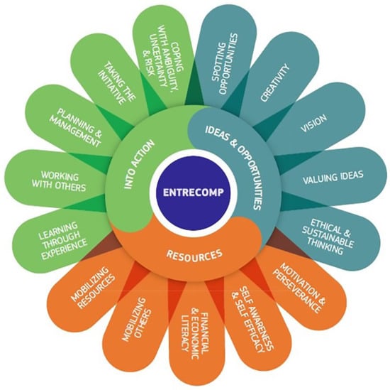 - Bacigalupo, M.; Kampylis, P.; Punie, Y.; Brande, G. EntreComp: The Entrepreneurship Competence Framework; Publication Office of the European Union: Luxembourg, Germany, 2016. [Google Scholar]