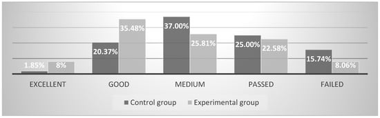 As shown by the sample data in Figure 1, compared to the control group, the experimental group showed a decrease in the proportion of students in the low-scoring band (failing, passing, and moderate) and an increase in the proportion of students in the high-scoring band (good and excellent). Together with the statistically significant increase in good grades, these findings ensure a significant increase in the experimental group compared to the control group.