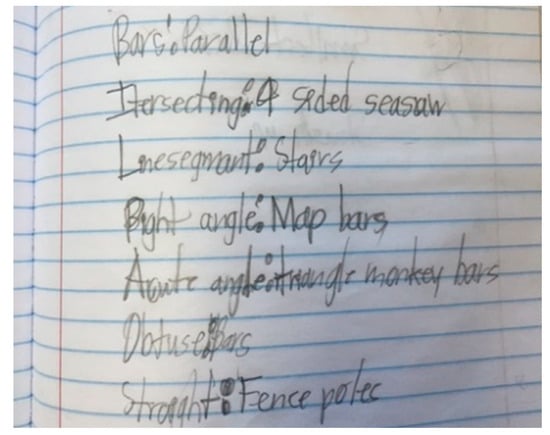 To illustrate this case, we present an example from Kendall’s third cycle in the approximation of practice. Kendall began her engagement in the practice space by examining a piece of written work that involved students identifying angles on the playground (see Figure 2). Kendall stated, “I think that she’s got a very good handle on all of them” (finding angles on the playground) and highlighted that a student identified the monkey bars as an example of an acute angle, an affirmation that the chosen task was effective in helping Kendall determine the student’s understanding of angles.