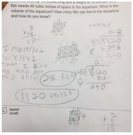 To illustrate Case 2, we present an example from Ingrid’s third cycle in the approximation of practice as she examined a piece of student written work that involved the following problem: Stella bought an aquarium with a rectangular base that measures 18 inches wide by 14 inches long and a height of 10 inches. One fish needs 40 cubic inches of space in the aquarium. What is the volume of the aquarium? How many fish can live in the aquarium and how do you know?