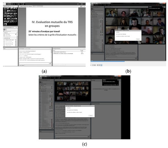 Screenshots of the online learning environment. Top left: (a) theory for the whole class; top right: (b) group work; (c) bottom: synthesis of group work in the whole class.