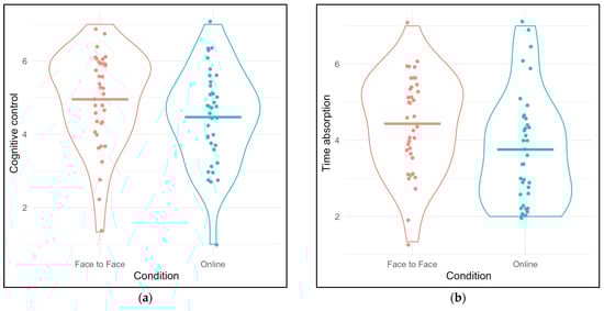 The results show a significant impact of the face-to-face setting on three of four dimensions of flow. Globally, the findings suggest that the in-person environment promotes cognitive absorption, time transformation, and autotelic experience. Other significant differences were not ascertained. It is possible to understand the better flow experience in the face-to-face environment compared to the distance learning environment as being related to the importance of direct social interactions for future teachers, as proposed by Donnelly [32]; it may also be related to digital barriers [18], which some teachers might have difficulty in overcoming. By contrast, however, and given that participants of the present study were familiar with working in distance learning environments, the proposition of a cultural habit may be invalid [7].