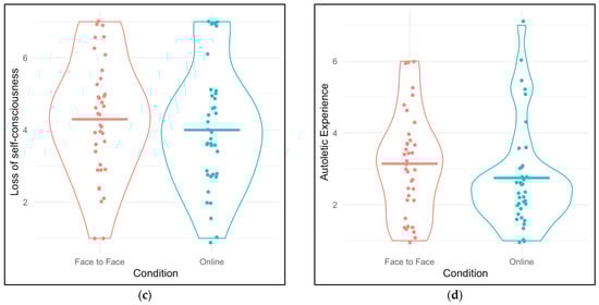 Main effect of the setting on (a) cognitive control, (b) time transformation, (c) loss of self-consciousness, and (d) autotelic experience, on a 7-point Likert scale.