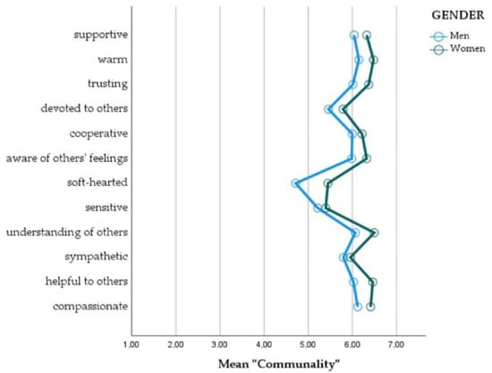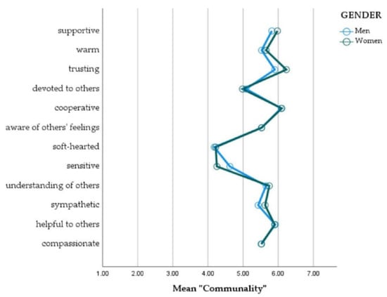 The graphical comparison of the mean values of the men and women in the sample showed that communal characteristics were considered desirable for women and men, with means between 4.00 and 7.00 (Figure 1 and Figure 2). In particular, the traits “sensitive” and “sympathetic” were desirable in women, as the line graphs of female and male prospective teachers were very close for these traits (Figure 1). The mean values showed that female prospective teachers believed more strongly than male prospective teachers in that communality is desirable for women in society. The men’s mean values, similar to those of the women, were almost entirely in the range between 5.00 and 7.00. From the men’s point of view, communal characteristics are, thus, desirable traits for women as well. Although the tendency of men’s and women’s evaluations of the communal traits were similar, the calculation of the effect size showed that men and women differed in their ratings of three traits: Thus, Cohen’s d showed medium effects for the traits “helpful to others” (|d| = 0.585), “understanding of others” (|d| = 0.522), and soft-hearted (|d| = 0.508).
