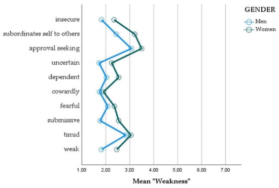In contrast, male prospective teachers had lower mean values when it came to the desirability of weak traits for men in society (Figure 4). Especially, traits such as “subordinates self to others”, “submissive”, and “weak” were not desirable in men. Although there are gaps visible in the line graph for men, the values reflected the same trend for weak traits for men and women in society. Cohen’s d showed no significant effects regarding the desirability of weak traits, either within, or between the groups.