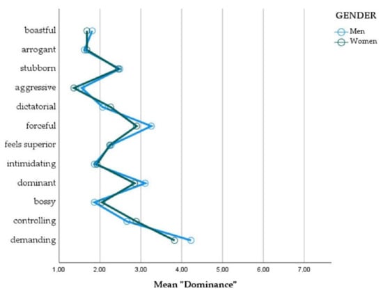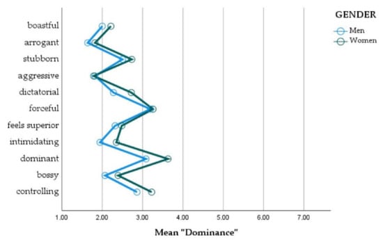 In contrast, female prospective teachers considered dominant traits slightly more desirable for men in society, having higher mean values than male prospective teachers (Figure 6). The mean values ranged from 1.00 to 4.00, and the tendency could be established that dominant traits were also rather undesirable in men.