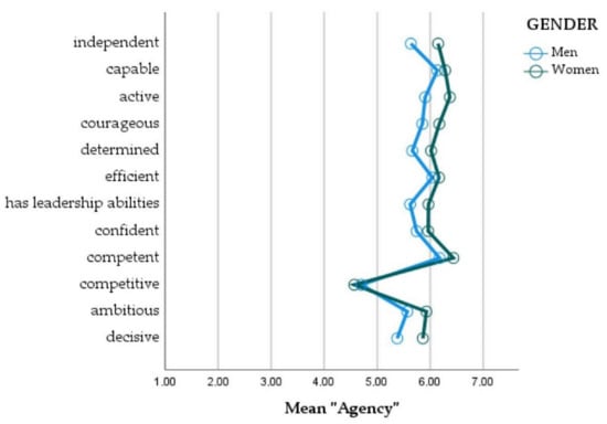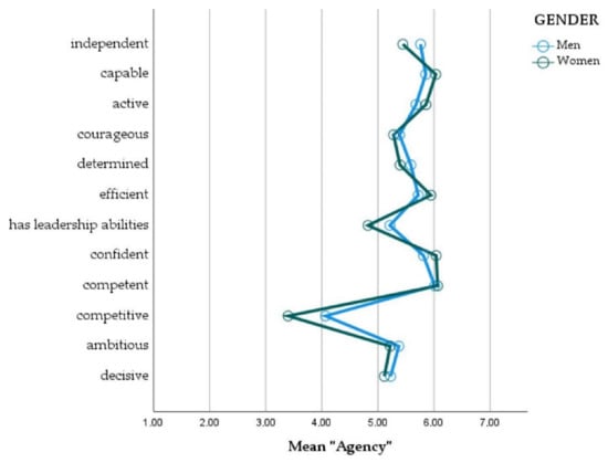 Agentic traits were desirable for women (Figure 7) and highly desirable for men (Figure 8). With one exception (“competitive”), the mean values for women were between 4.00 and 7.00, similar to the mean values for men. Female prospective teachers considered the traits “independent”, “has leadership abilities”, and “competitive” as the least desirable in women (Figure 7). Apart from the trait “competitive” (|d| = −0.568), agency for women was consistently seen as desirable from the perspective of female prospective teachers.