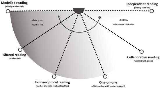 Figure 2 shows the coding themes and categories that were used and the conditions required of each, with consideration for the actor/s and agentic actions being described [13] (p. 227). For example, if the description implied that the teacher had an active role but the child did not, then the description would be coded as “modelled reading”. An instance of this included “The teacher introduces the book” [19] (p. 21). If other children had an active role in the description but the teacher did not, this was coded as “peer discussion/support” (i.e., collaborative teaching). An instance of this included “With support from… classmates, students can comprehend the text” [19] (p. 81). Note that the omitted text in the above quote was “the teacher or”; that is, “with support from the teacher or classmates, students can comprehend the text” (emphasis added). The omitted text (“With support from the teacher…”) was coded separately as “child led: child reading with teacher support”. Table 1 details the descriptions that were used for each category, with examples sourced from one of the analysed texts [19].