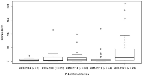 Sample sizes of N = 1 e.g., [39] to N = 210 were present in the reviewed studies [40]. Only 3.8% of the studies had a sample size of more than 100 teachers, while 67.4% had fewer than 10 participants. Figure 2 illustrates the changes in the sample sizes throughout the years of the studies. Ignoring the used PCK modelling, it is obvious that since the publication of the RCM in the last two years, the studies have investigated the PCK of more participants. Figure 2 presents the sample sizes of the studies by year of publication. An increase in sample size from 2020 onwards can be seen that was primarily achieved through surveys of pre-service teachers at the researchers’ universities e.g., [41,42].