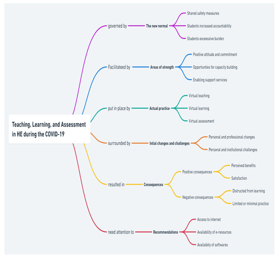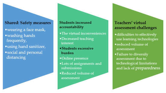 As shown in Figure 2, the list of shared new normal include: safety measures, including wearing a face mask; washing hands frequently; using hand sanitizer; and social and personal distancing. The new normal for students includes: increased accountability, which they were forced to take on due to virtual inconveniences and decreased teaching interest. As well, they reported that they had an excessive burden due to online presence and the completion of numerous assignments and submissions. From the teachers’ perspective, the reduced volume of assessment was taken as a new normal due to virtual learning. Moreover, teachers took extra measures to accomplish the examination of students Ph.D. research proposals and dissertations. For example, the external and internal examiners exchanged different variants of feedback and questions as a backup plan.