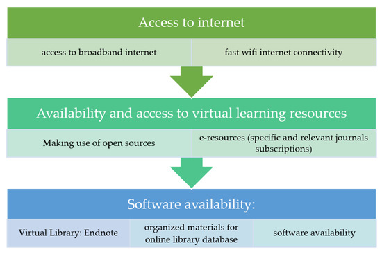As clearly indicated in Figure 3, the university should strive to improve infrastructure and facilities on three fronts. These include access to the Internet, virtual learning resources, and relevant software. Moreover, most of the study participants strongly recommended the need to focus on the virtual environment as a central component of the university academic program. Moreover, the study participants highlighted the importance of student empowerment in creativity, critical thinking, and problem solving. Other recommendations included the provision of professional development opportunities for teachers to learn and practice various e-learning and e-assessment methods, together with continual support both on the e-pedagogical and technological fronts.