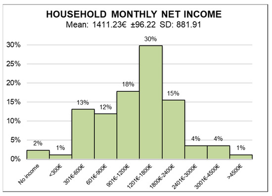 According to the data about income, the average monthly net income of the sample was EUR 1411.23€ ± 96.22 (see more in
