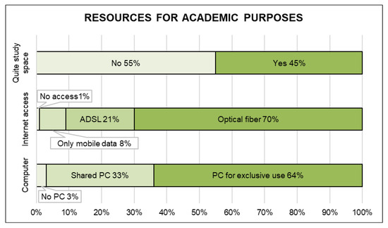 Figure 2. This aspect has been of special relevance in recent years due to university closures and attendance restrictions derived from the COVID-19 pandemic. Hence, we observed that 55% of the respondents lacked a quiet space to study, 9% did not have a broadband internet connection and 36% did not have a computer for their exclusive use.