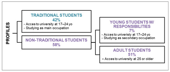 Figure 4 shows the criteria followed to assign participants to each of the profiles. Traditional students included those who accessed university from age 17 to 24 by the mainstream Spanish educational system routes (high school, baccalaureate, vocational training) and for whom studying was the main occupation; they do not have family responsibilities and do not work, or they just work part-time. These constitute 42% of the participants in the survey. The remaining 58% of the sample were non-traditional students, although they belong to two very differentiated categories in terms of university experience and needs. On the one hand, we identified mature students who had accessed university when they were over 24 years of age (51% of the sample). On the other hand, we found young students who started university at the ages of 17 to 24 by the mainstream access routes but for whom studying was not their main occupation because they had family responsibilities and/or worked full-time (7% of the sample).
