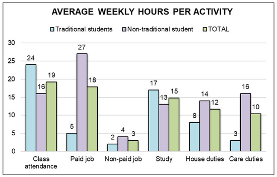 Participants showed great dedication both to paid work (18 ± 1.68 h per week) as well as to household chores (12 ± 1.34 h) and care (10 ± 1.55 h). In this case, there were significant differences between traditional and non-traditional students, with averages of 5 ± 1, 8 ± 1.52 and 3 ± 0.99 for the former compared to 27 ± 2.04, 14 ± 1.98 and 16 ± 2.31 for the latter. Regarding the distribution by gender, men reported a higher dedication on average to paid work—21 ± 2.45 h for men versus 15 ± 2.24 for women—while the trend was reversed in relation to housework and care—6 ± 0.69 h and 9 ± 1.85, respectively, for men, compared to 18 ± 2.34 h and 12 ± 2.5 for women—(details can be seen in