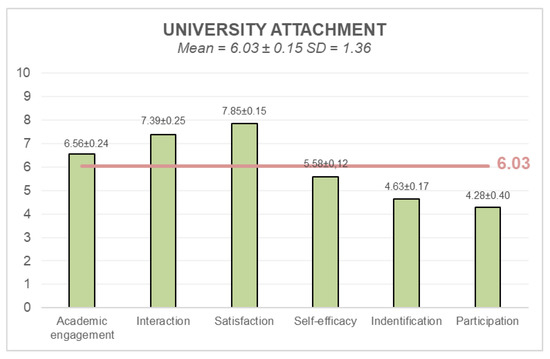 On a scale of 1 to 10, the mean university attachment of participants in this study was 6.03 ± 0.15. The dimensions that stood out were satisfaction (7.85 ± 0.15) and social interactions (7.39 ± 0.25). In contrast, the dimensions identified as detrimental for university attachment were participation (4.28 ± 0.4) and identification (4.63 ± 0.17). Roma students participating in this study reported a lack of cultural identification with an institution where Roma culture is not present at all.