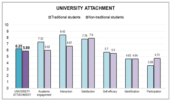 Regarding student profiles, traditional students showed a stronger attachment (6.25 ± 0.22) than non-traditional students (5.89 ± 0.20). As mentioned in the previous section, non-traditional students have other responsibilities such as jobs and family, resulting in less dedication to university than traditional students. This affects not only academic engagement but also social interactions, which were the two aspects in which non-traditional students in the sample scored lower (6.02 ± 0.34 and 6.67 ± 0.3, respectively) than traditional students (7.31 ± 0.31 and 8.42 ± 0.32, respectively). Non-traditional students obtained remarkably higher scores in participation (4.73 ± 0.50 compared to the 3.59 ± 0.66 of traditional students). Nevertheless, the dimensions of satisfaction, self-efficacy and identification were similar in both profiles (7.78 ± 0.26; 5.7 ± 0.18 and 4.63 ± 0.23, respectively, for traditional students versus 7.9 ± 0.19; 5.5 ± 0.17 and 4.64 ± 0.24, respectively, for non-traditional students). Details can be seen in