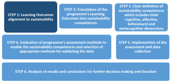 Representation of the six steps included in the sustainability competence assessment framework (authors’ own work).
